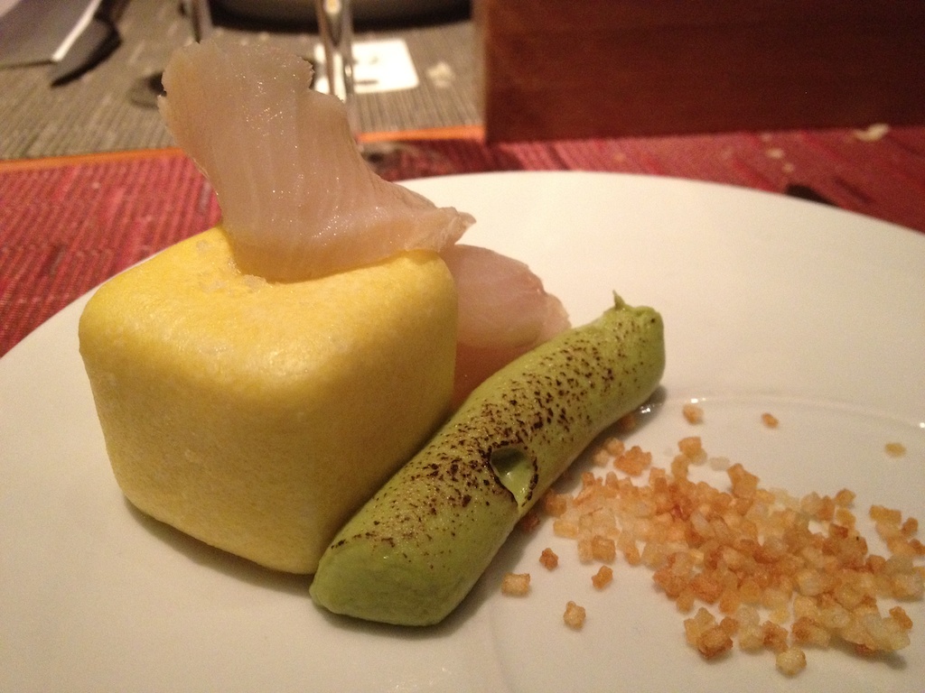 But on to the first course! Another pour of the Schramsberg started it off right! Out comes the Scrambled Egg Ravioli, Charred Avocado, Hamachi. Holy guacamole! I was obsessed with this, whereas the Fiancé wasn't quite as crazy enthused over it. It had been molded into that square but the inside was warm and soft with an amazing texture. Basically it was like the best lightly scrambled egg I'd ever had. And the charred avocado? Like velvet. It was served with little crispy potato confetti. Basically a deconstructed omelette with home fries! Oh, and a piece of hamachi to go with it!